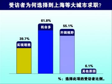 针对目前在上海读书以及曾经在上海读书的部分人群调查显示,有43.2%的受访者坦言,当初到上海求学,就是希望毕业后留在上海工作或生活; 55.6%的人认为学校教育质量好, 22.7%的人以在上海等大城市上学为荣。