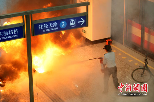 演练设置的情景是:兴隆大街地铁站上行列车某车厢内突然电器柜起火,浓烟较大,并有人员被困。因事故升级,地铁内部工作人员在先期处置的同时,立即向有关部门报告求援,于是展开了一场联动应急救援。