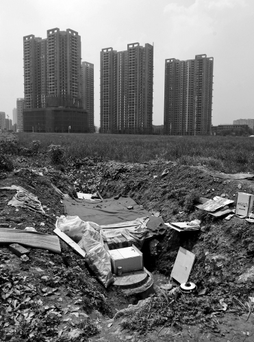 小伙生活的这块荒地上已长满杂草,这里曾是一个拆迁工地,工地施工时留下两个大坑,其中一个靠近公路边的坑就成了他的家。