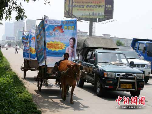 据牛车的主人交待,他们都是港北区港城镇棉村的村民,几天前在村里放牛时,有位自称是某品牌热水器的经销商找到他们,请他们在牛车上张挂某品牌热水器的广告牌,然后在马路上巡走,每天可获得100块的酬劳。听到这等“好事”,村民们马上就答应了,从6月3日开始,这四辆牛车正式“上岗”,开始的时候还只是在郊区的道路上走一走,今天就堂而皇之地走上了城区的主干道。
