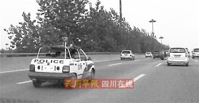 网友“双鱼情史”在论坛上传了数张自己日前在马路上拍摄的“敞篷版”拓拓图片,图片中的奥拓车可谓一个“牛”字:没有车牌,除了挡风玻璃外,四扇玻璃和车顶都已卸去,车身印有如警车一样的警盾标识,该车还正在马路上飞驰。“双鱼情史”发文说,当时这辆车正在川藏立交上行驶,无牌、无顶、警识、拉风,全占齐喽,的确霸道。
