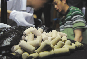 民警还发现,“大虎”家一个房间像个小工厂似的,里面有很多奇形怪状的工具。“大虎”的老婆交代,这些工具是用来制毒的。有一种不锈钢的棍子,是专门用于给毒品成型的,毒贩将毒品粉末填入模具,用棍子捣实,再从模具中倒出来,就成了一个个高5厘米重10克左右的圆柱状物体,这样做的目的是将计量标准化,方便交易。