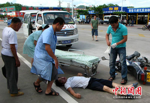 中新网阳江6月21日电(记者 陈明)21日下午3时30分许,广东阳江一骑着摩托车的青年男子,在市区体育路路段突然晕倒在地,经急送医院抢球后已脱离危险。