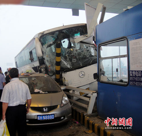 中新网淮安6月21日电(衡中强 姜李 朱晓颖)21日早晨5时14分,江苏淮安市城南消防中队接警称:宿淮盐高速淮安南出口出一辆载客的大巴车冲进收费站,有人被困。城南消防中队立即出动救援力量赶赴现场实施救援。