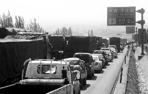 而在京新高速路上,被堵的大多数是运煤车。一位司机坦言,堵车增加了运输成本,“本来费用是6000多,这一堵,会多出1000多块钱。”