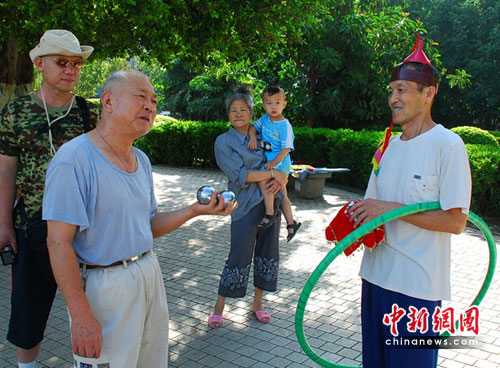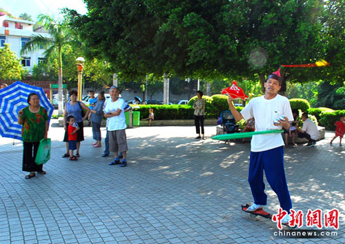 中新网攀枝花市6月25日电(记者刘忠俊)“脚划滑板、腰转呼啦圈、右手转手帕、左手转健身球、头转辫子,全身都在转,这个大爷真牛!” 25日,四川攀枝花城区金福社区广场上不时传来阵阵惊呼声。“奇人呀,是不是耍杂技的哦!”每当“牛人”出现在小区广场锻炼,当地群众无不拍手叫绝,甚至有人怀疑他是专业杂技演员。这人就是65岁的奇人王兴华。