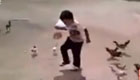 实拍男孩手拿美食遭鸡群围攻