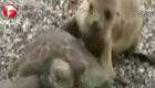 实拍胖海狮骑着海龟逛沙滩