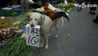 狗狗身背两只鸡口叼价格牌在市场摆摊