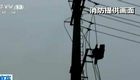 实拍:十岁男孩赌气爬上电线杆