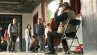 4月27日,油漆工、清洁工、厨师等劳动人民齐聚重庆街头,把自己常用的劳动工具作为舞蹈道具。他们希望以“快闪”表演秀出自己的“劳动style”。