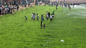 青岛沿海遭大规模浒苔侵袭 场面壮观