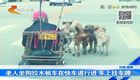 老人坐狗拉木板车在快车道行进 车上挂车牌