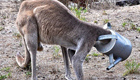 袋鼠喝水遭铁桶夹头