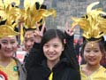 美女记者与祭祖演员合影