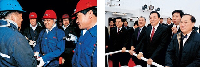 2009年12月15日,李克强在珠海出席港珠澳大桥开工仪式后乘船前往海上施工现场考察。新华社记者黄敬文摄(上图右)