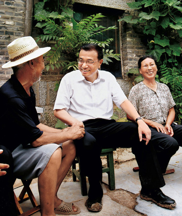 2010年7月8日,李克强在山东济宁市嘉祥县大孙村与贫困户孙树节一家亲切交谈。新华社发