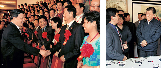 2007年4月7日,刘云山在河南省民权县王公庄村画虎村调研时,在该村"四大虎王"之一王建民的画室里了解村民从事绘画产业情况。新华社发(崔申义摄)(上图左2)