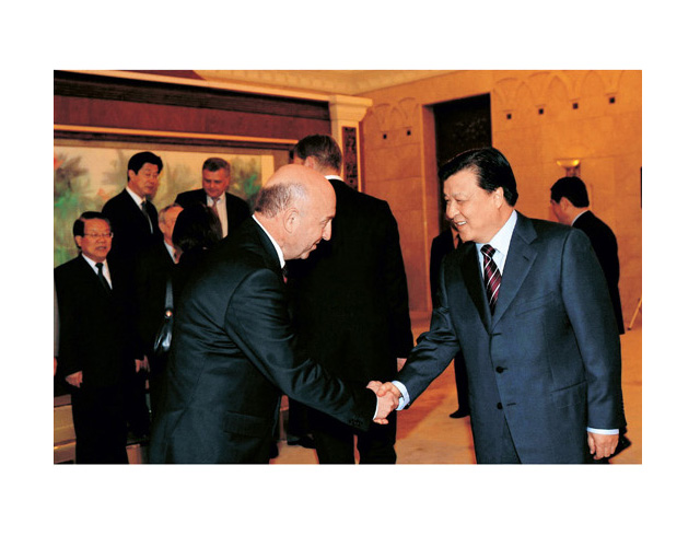 2006年5月11日,刘云山在北京人民大会堂会见俄罗斯主流媒体负责人访华团。图为刘云山与俄方人员握手。新华社记者刘卫兵摄