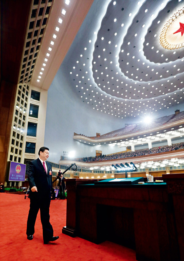 2013年3月14日,十二届全国人大一次会议在北京人民大会堂举行第四次全体会议。习近平当选中华人民共和国主席、中华人民共和国中央军事委员会主席。3月17日,十二届全国人大一次会议在北京人民大会堂举行闭幕会。国家主席习近平发表重要讲话。这是习近平走向讲台。新华社记者兰红光摄