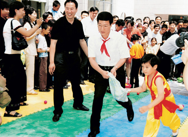 2005年6月1日,张高丽来到山东省济南市妇女儿童活动中心看望小朋友们。新华社发(訾秉会摄)