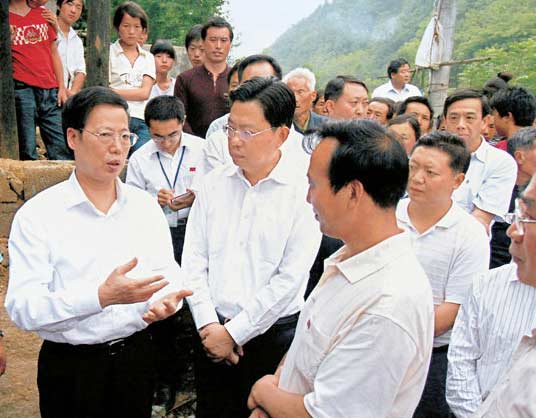 2008年6月18日,张高丽在地震重灾区陕西省宁强县汉源镇亢家洞村五里坡组,与当地领导同志共同研究天津市对口支援该县恢复重建工作。新华社记者刘书云摄