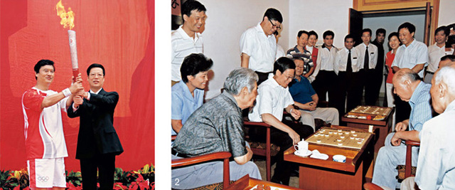 2008年8月5日,张高丽看望慰问天津市离退休老同志,与市人大常委会原主任吴振同志下棋。新华社发(宋子明摄)(上图左2)