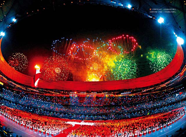 2008年8月8日,北京奥运会开幕式,国家体育场(鸟巢)上空绽放五环烟花。