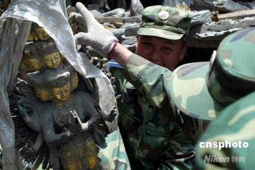 图:都江堰“鱼嘴”上的石碑被地震损毁
