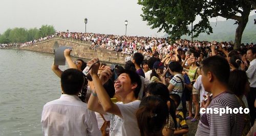 中国各地群众观看日食奇观:西湖观"食"人如潮
