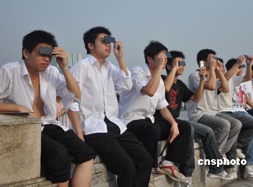 中国各地群众观看日食奇观:杭州宝石山上看日食