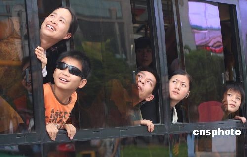 中国各地群众观看日食奇观:南宁市民公交车上观日偏食