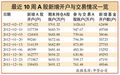 中登公司最新公布的数据显示,上周(13日~17日),新增A股开户数18.7万户。这一数字比之前一周增长了19%,并且创下自去年10月份以来5个月的新高。