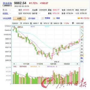 随着股指的连续走强,沪深两市成交量突然暴增。数据显示,昨日沪市累计成交1091亿元,深市成交1082.2亿元,合计2173.2亿元,创下自2011年11月3日以来的新高。