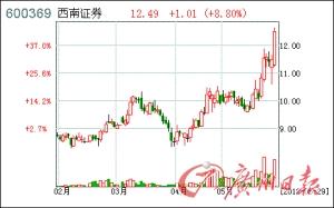 券商股昨日表现活跃,截止收盘,券商股涨3.23%。个股全线上涨,西南证券涨8.8%领涨,宏源证券、太平洋和国元证券涨幅超过4%,兴业证券、招商证券、西部证券、长江证券和东吴证券涨幅超过3%,方正证券涨2.94%,国海证券涨1.29%涨幅最少垫底。
