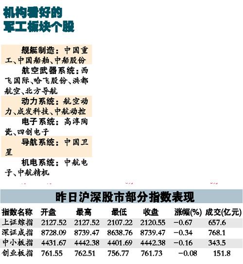 昨天船舶制造、飞机制造、军工航天、海工装备、卫星导航、高端装备等相关板块上涨,其中军工板块出现涨停潮,截至收盘,北方导航、中原特钢、抚顺特钢、亚星锚链、舜天船舶、西仪股份六只军工股票涨停,中船股份、中国船舶等涨逾6%。