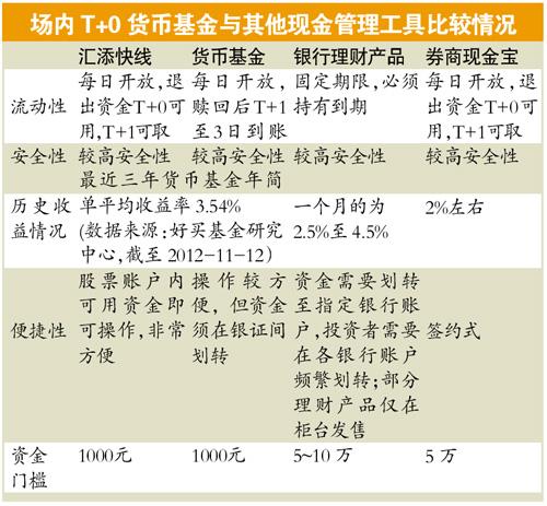 场内T+0货币基金的投资门槛可低至1000元,而对于券商、银行理财产品,股民参与的门槛一般要5万元。