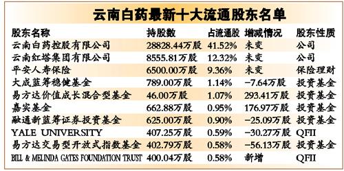 记者发现,这家看似问题缠身的公司,机构却对其青睐有加,如包括博时基金,汇添富基金等近70家机构曾前往云南白药实地调研。年报显示,截至去年12月底,在前十大流通股东中,易方达和嘉实基金两家机构分别加仓云南白药293.41万股和176.97万股。而在前十大流通股东中,盖茨基金成为最大的亮点。
