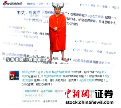 在上周五沪指大涨逾2%并收复2200点后,周二又和老艾开了个玩笑,开盘后沪指一路下挫,再次跌破老艾和股锋之间裸奔赌局的输赢点位2200点,多次表态“愿以裸奔换取A股大底”的老艾决定不再等待,23日履行裸奔诺言。
