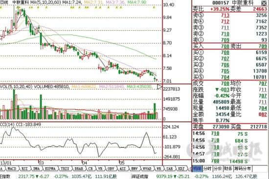 中联重科(000157)前日就媒体报道其华中地区销售业绩失真一事作出澄清并复牌。在大盘表现平稳的情况下,该股近两日出现连续调整态势,创出年内新低7.01元。