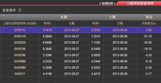 最新Shibor利率:流动性危局未解关于近期银行间市场流动性紧张问题,央行此前在一天之内三度表态,称市场流动性整体充裕,同时已经向部分金融机构释放了流动性。受此影响,持续近一个月的“钱荒”现象终于得到缓解,标志性的隔夜Shibor利率连续四个交易日下降。然而,今天中午最新发布的数据显示,隔夜Shibor利率在连续四天回落后,再次出现了小幅上涨。同时,1周、2周及1月Shibor利率虽然出现不同程度的回落,但是绝对水平依然高企,表明资金面紧张形势还在延续。