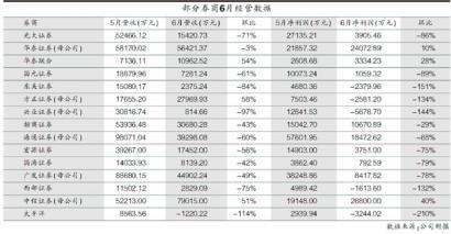 6月东吴证券净利润为-2379.96万,环比下降151%;兴业证券则亏损5678.7万,降幅为144%。此外,西部证券(002673,收盘价11.00元)亏损1613.6万元,太平洋亏损3244.02万元。