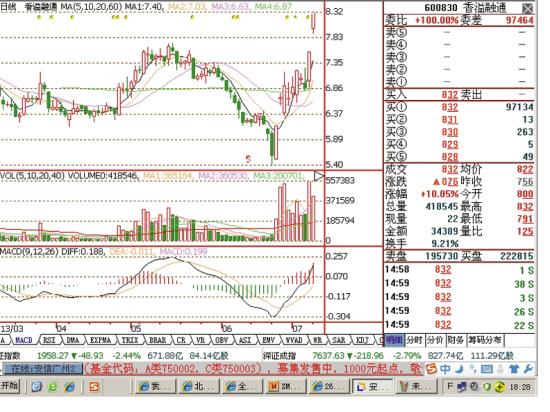 6月25日,该股逆市涨停后,6月26日至7月4日主要在7元上下平台整理保持强势,上周五下午再度涨停,昨日则是连续第二个涨停,收报8.32元。从过程看,正好和上述“金融国十条”的公布时间相吻合,和热钱的炒作正合拍。