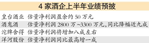 事实上,今年酒类板块中的企业业绩均有滑坡迹象。据Wind统计数据显示,在已发布今年中报预告的上市白酒企业中,除了洋河股份预告净利润略增10%外,沱牌舍得、酒鬼酒、皇台酒业的业绩均大幅下滑,幅度分别为80%、89%、107%。因此,业内人士普遍认为今年白酒行业整体利润下滑已经成为大概率事件。“白酒的中报业绩还是会很低迷,可能维持和一季度差不多的水平,这是一个业绩探底的过程。”瑞银证券研究员王鹏表示。