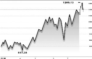 上周,创业板指数在冲高至1208.13点后出现大幅震荡——周四股指在没有明显利空的情况下,全天大跌4.4%;周五股指虽有所企稳,但成交量却明显萎缩。