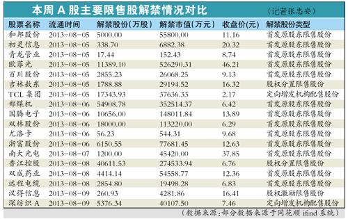 在个股方面,郑煤机的解禁量最大。该公司最新公告显示,8月6日将有5.49亿股的首发原始股解禁上市,占公司33.87%的股份。如果按6.42元的最新收盘价计算,市值35.25亿元。值得注意的是,牛股欧菲光本周也将有超1亿股的限售股出笼,合计市值高达52.63亿元,为当周解禁规模最大的上市公司,占比达到三成。