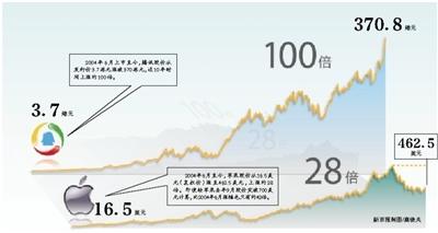 腾讯的这种上涨幅度,将科技股中的翘楚苹果公司也远远抛在了身后。2004年6月至今,苹果的股价上涨约28倍。即便按苹果去年9月股价突破700美元计算,比2004年6月也只上涨约42倍。