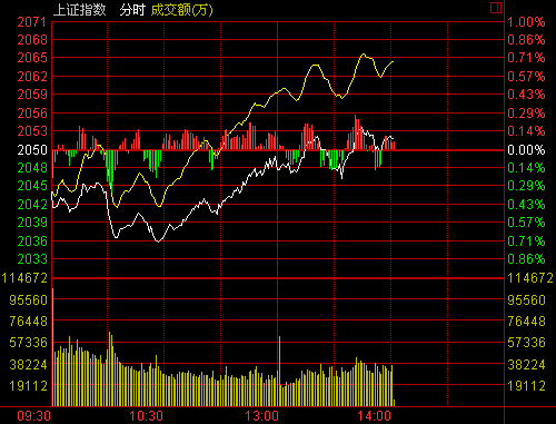 新华网消息 6日两市低开后下挫,呈现调整态势。金融、地产等权重股表现萎靡,传媒娱乐、手游、互联网信息等概念板块继续走热。股指盘中探底回升,午后创业板再创反弹新高,沪指于2050点关口上下震荡。截至下午14点,沪指报2052.76点,上涨2.28点,涨幅0.11%,成交609.11亿元;深成指报8102.79点,上涨42.40点,涨幅0.53%,成交636.98亿元;创业板指报1214.50点,上涨11.67点,涨幅0.97%。