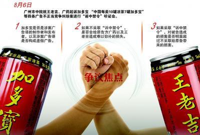 昨日(8月6日),广州市中级人民法院(以下简称广州中院)就王老吉大健康公司(以下简称王老吉)、广州医药集团有限公司 (以下简称广药)起诉广东加多宝公司(以下简称加多宝)“中国每卖10罐凉茶7罐加多宝”等四条广告不正当竞争纠纷案进行“诉中禁令”听证会。