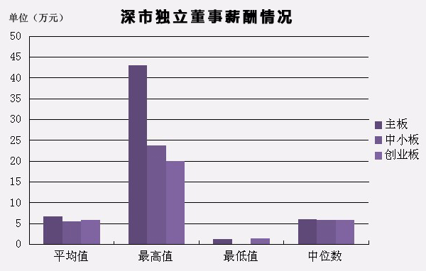统计显示,以主板、中小板及创业板为主要构成的深圳证券市场独立董事年薪平均值分别为6.8万、5.6万和5.8万。主板以平安银行独董年薪最高,年收入达43万元,中小板上海莱士独董年薪为23.8万,创业板大富科技独董年薪20万。深市上市公司也出现了无薪独董,如广宇发展、靖远煤电、兰州黄河、海螺型材、中航光电、启明信息、苏大维格等上市公司,也出现了无薪董事,这与国际证券市场惯例相符。